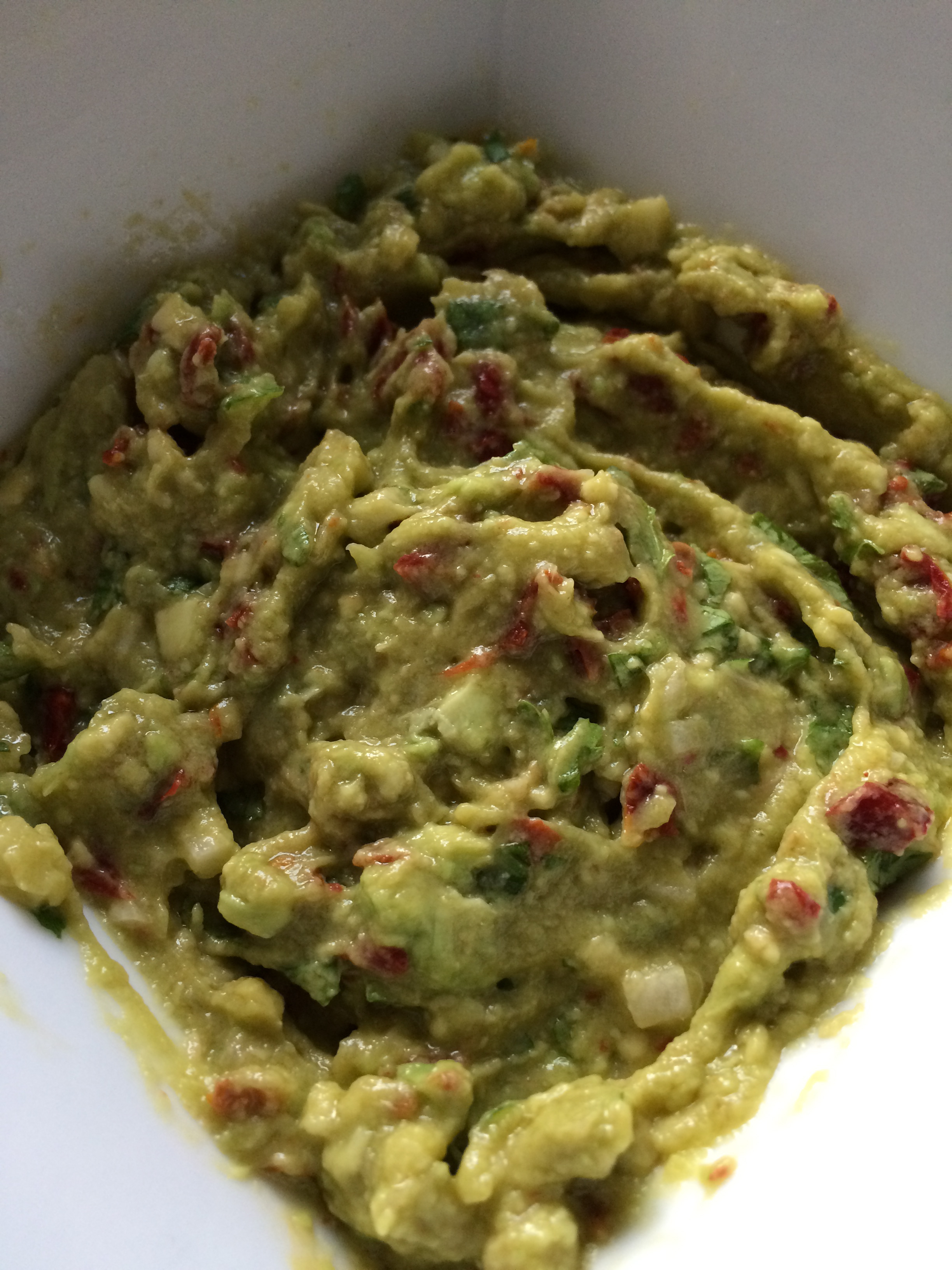 Scoop the guacamole into a serving dish, sprinkle with a little chopped cilantro and sun-dried tomatoes.
