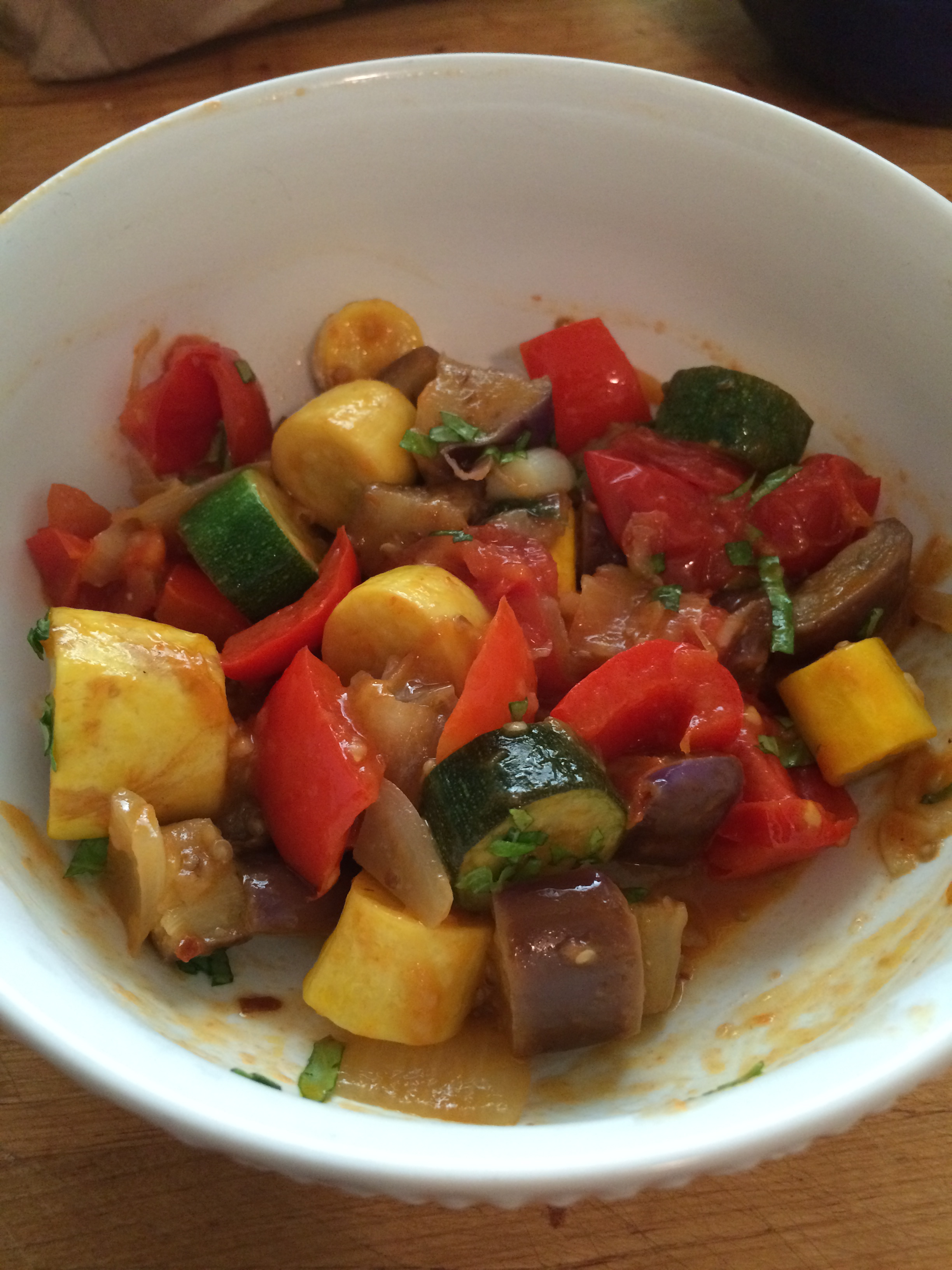 This is also an easy recipe to halve, which is what I did. I used one small Chinese eggplant, two small onions, one red bell pepper, a bunch of baby squash, and a handful of large cherry tomatoes. The original recipe called for about 1 pound of each vegetable so halving or doubling it is easy math. I highly recommend eating this with some good quality bread because you will want to eat every last bit of sauce in the bowl. Though there is no shame in licking the bowl clean. Licking the bowl clean is a thing of triumph. Never let anyone tell you different.